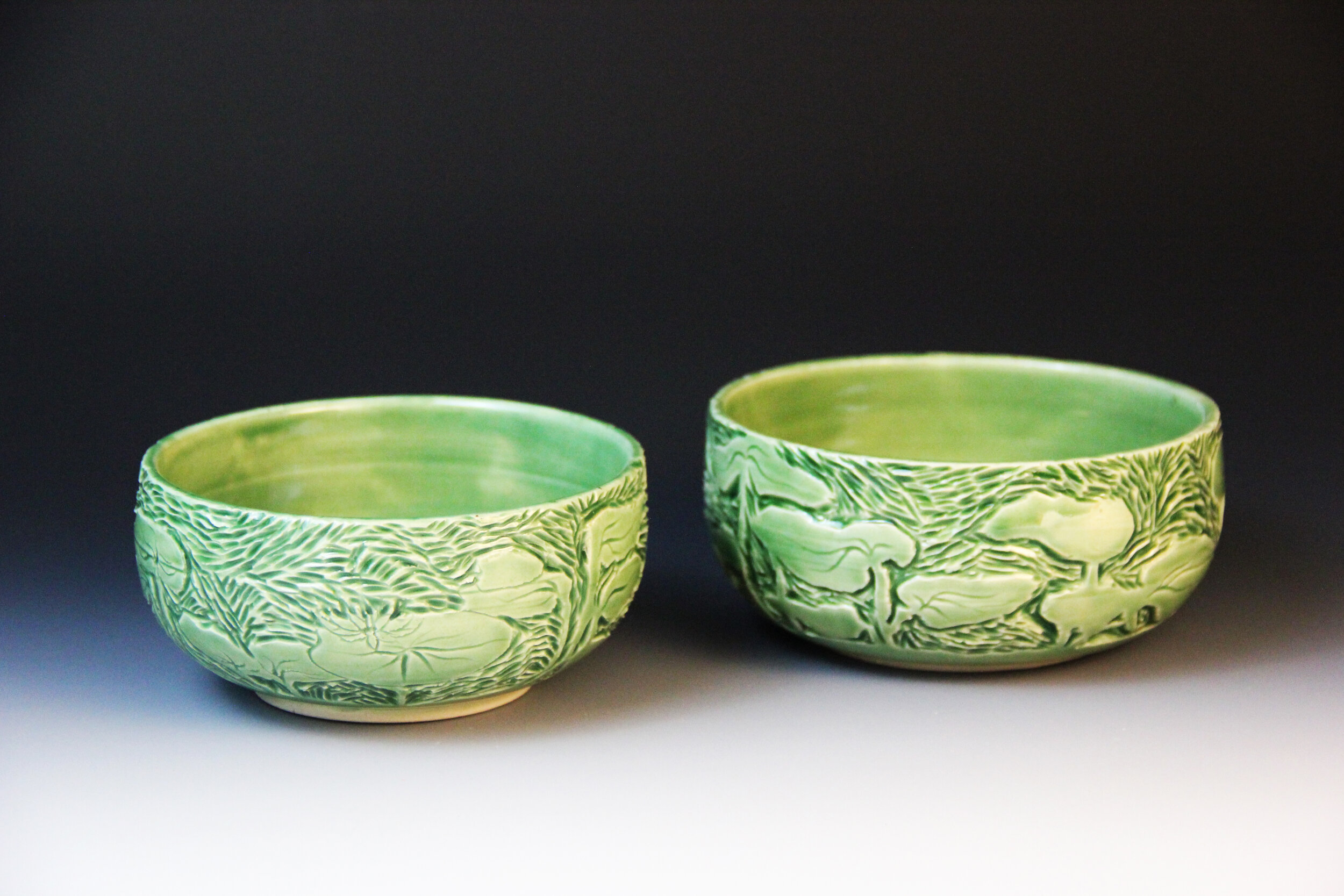 "Lotus" white clay, bisque to c04, carved and glazed to c5